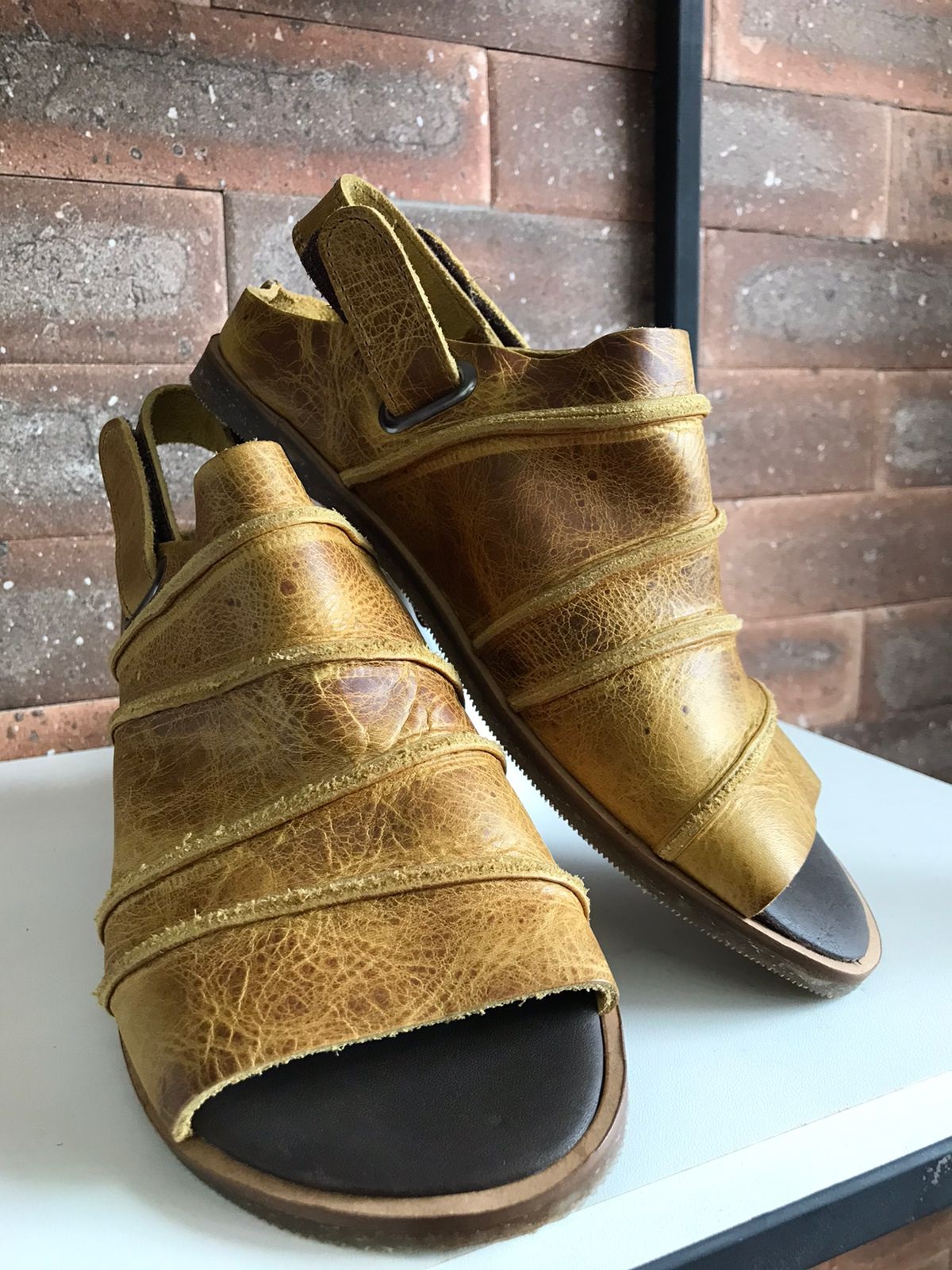 Sandália em couro fóssil, com acabamento rústico, na cor mostarda. Tira traseira remomível que, ao ser retirada, transforma esta sandália em uma linda mule. Palmilha com espuma macia e solado antiderrapante.