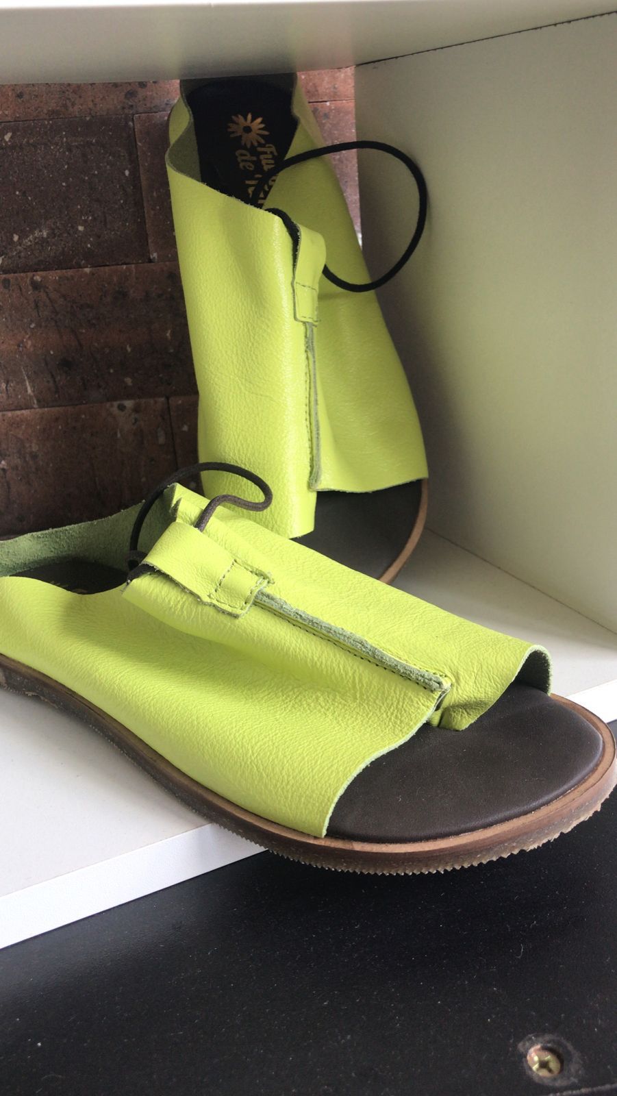 Sandália em couro, cor limão, que pode ser usada com o cadarço amarrado na perna ou sem ele, como uma charmosa mule. Solado de borracha reciclada antiderrapante. Linda para ser usada em qualquer estação.