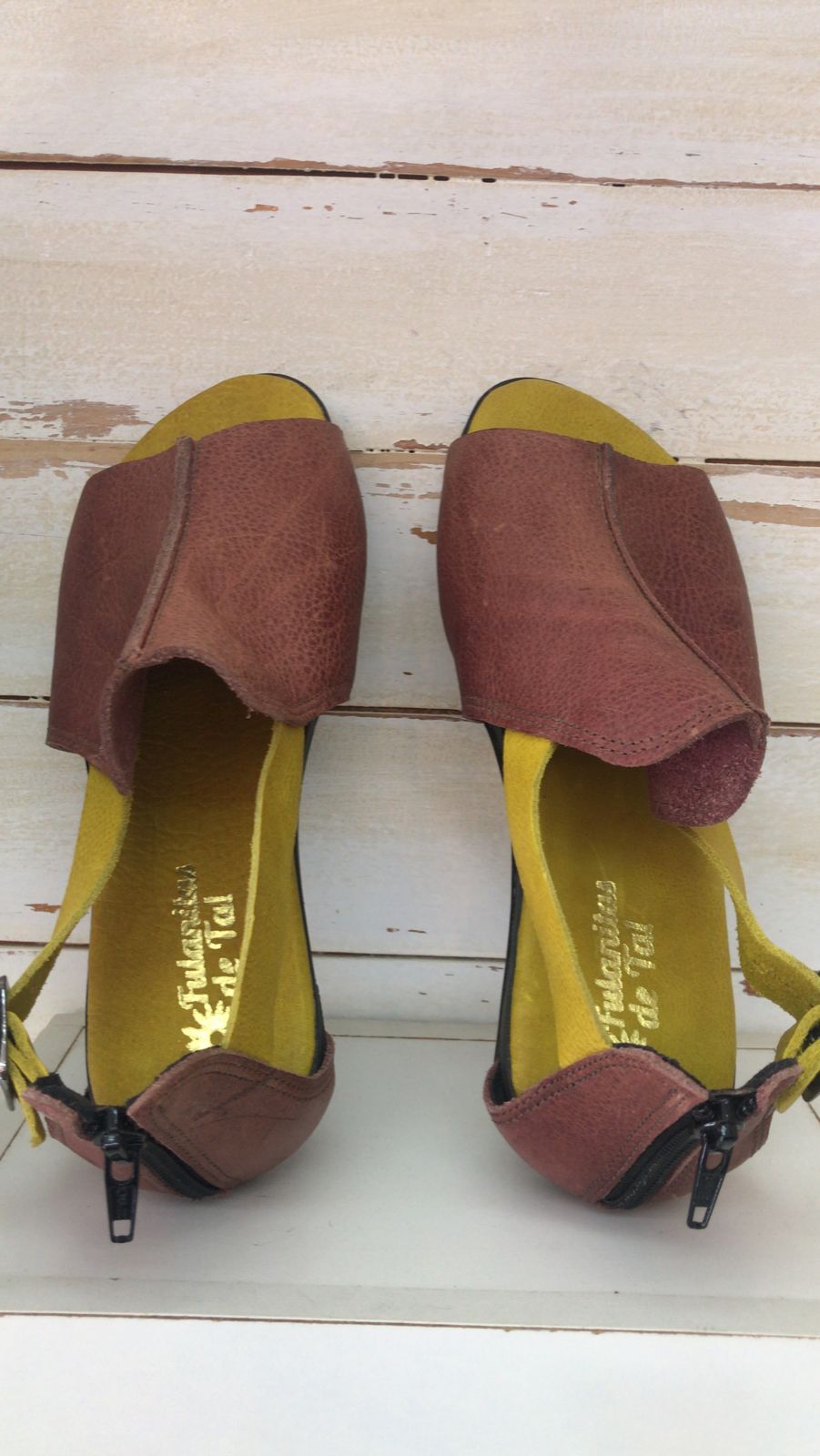 Sandália em couro na cor açaí, com tiras laterais em couro na cor mostarda. Zíper atrás, para facilitar o calce. Palmilha forrada com espuma macia e solado antiderrapante.