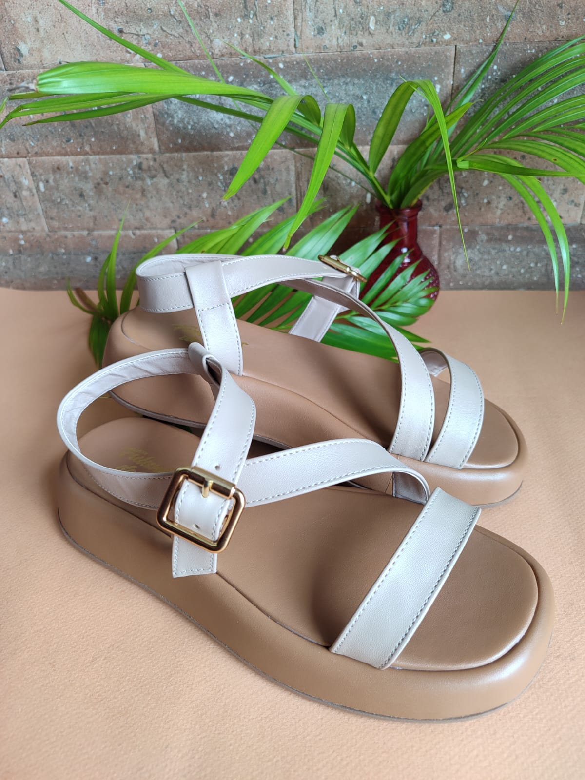 Sandálias em couro na cor nude, solado amêndoa, solado de borracha antiderrapante. Na lateral, fechamento com fivela dourada.