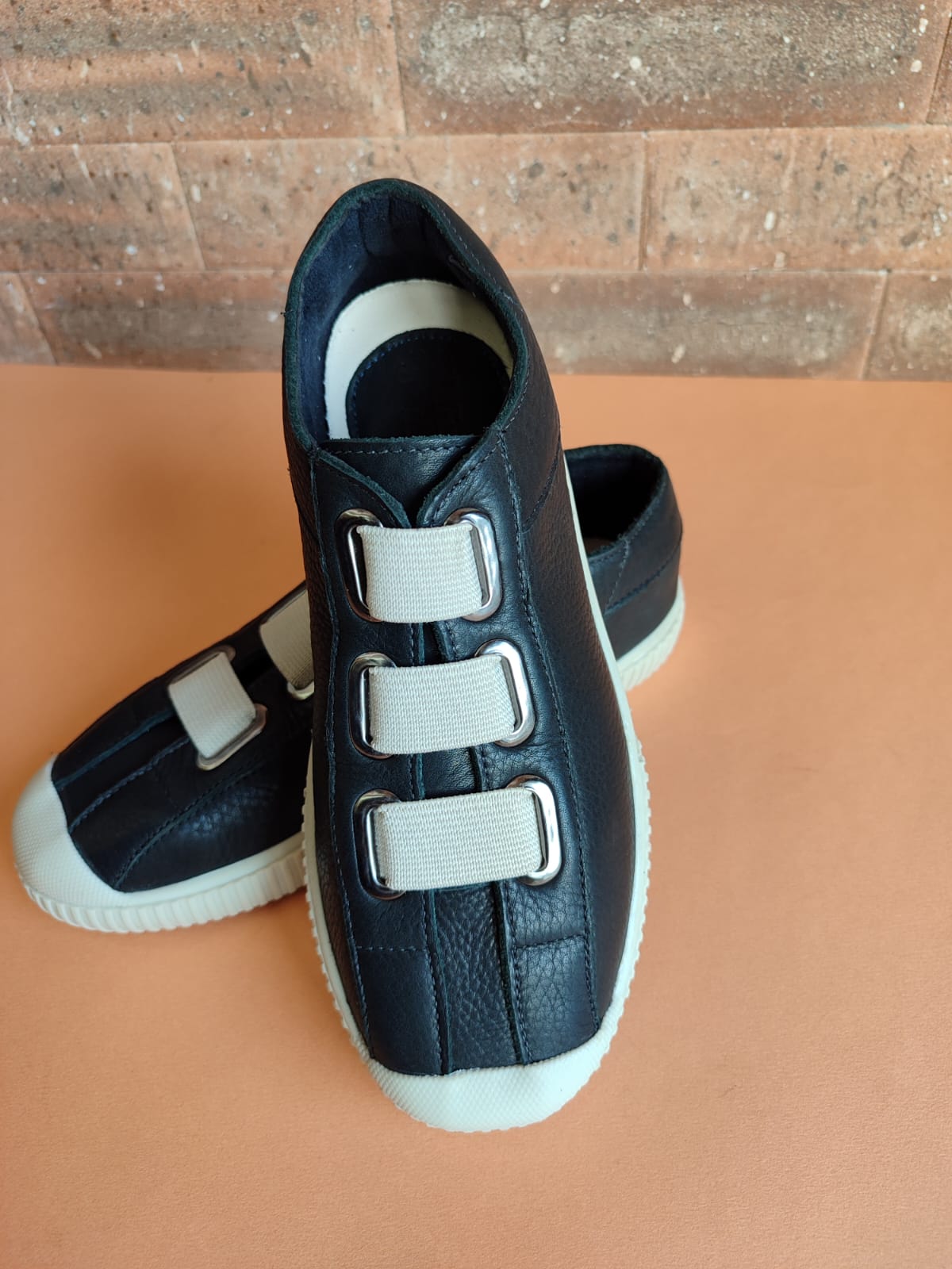 Tênis em couro, curtido em toneis de óleos, na cor preta. Costuras em branco, combinando com o solado off white e antiderrapante. Sobre o peito do pé, três elásticos de cor off white, passando por ilhoses retângulos, super modernos.
