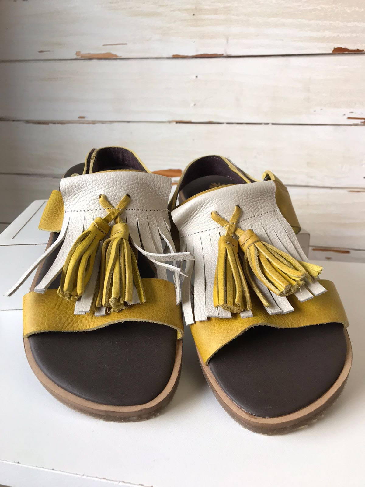 Sandália em couro mostarda e off white, com uma charmosa franja clara sobre o couro colorido. Palmilha macia e solado antiderrapante.