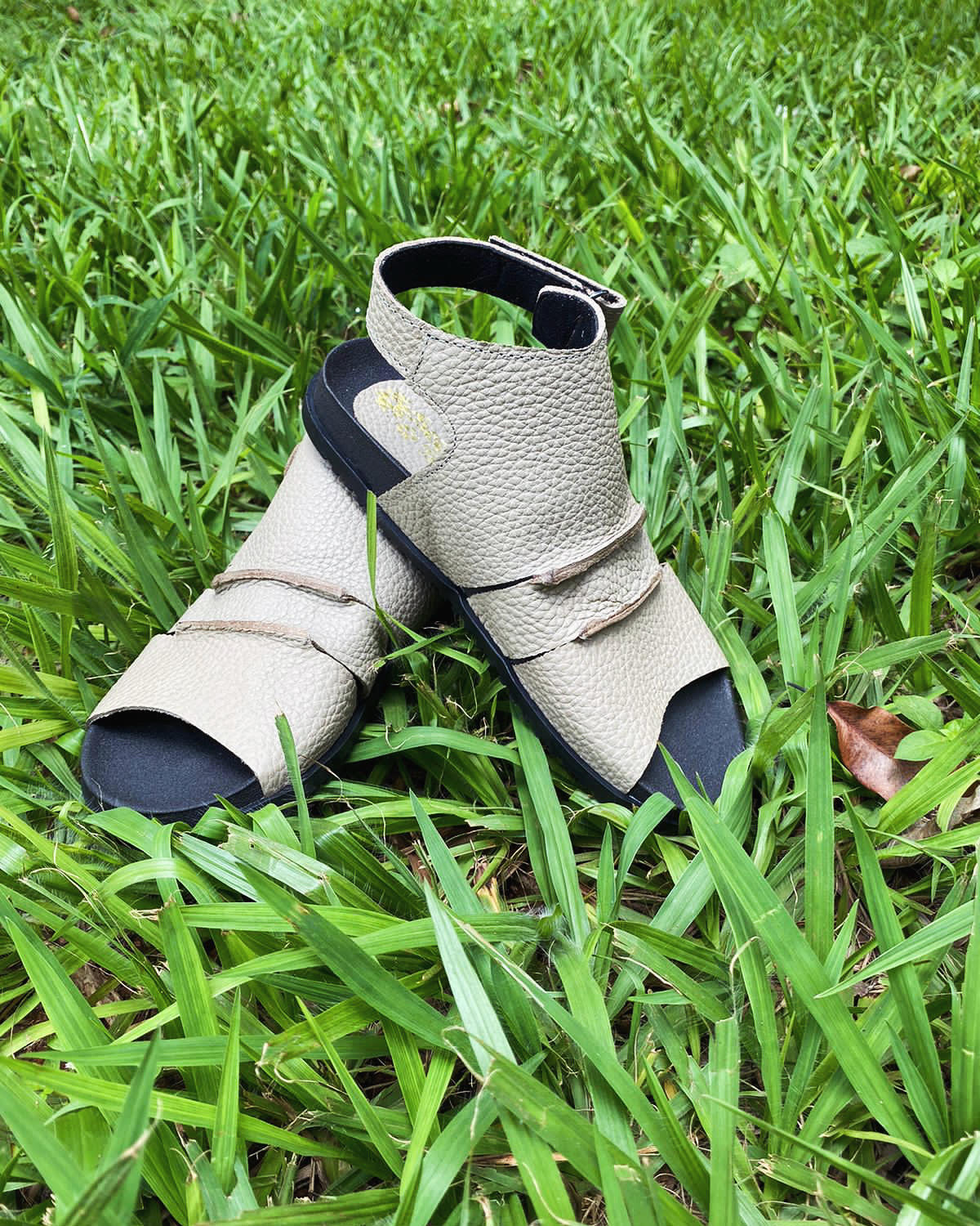 Sandálias em couro tipo floter, na cor gelo. O modelo favorece o uso nos dias mais frios, porque protege todo o pé. Solado em borracha reciclada.