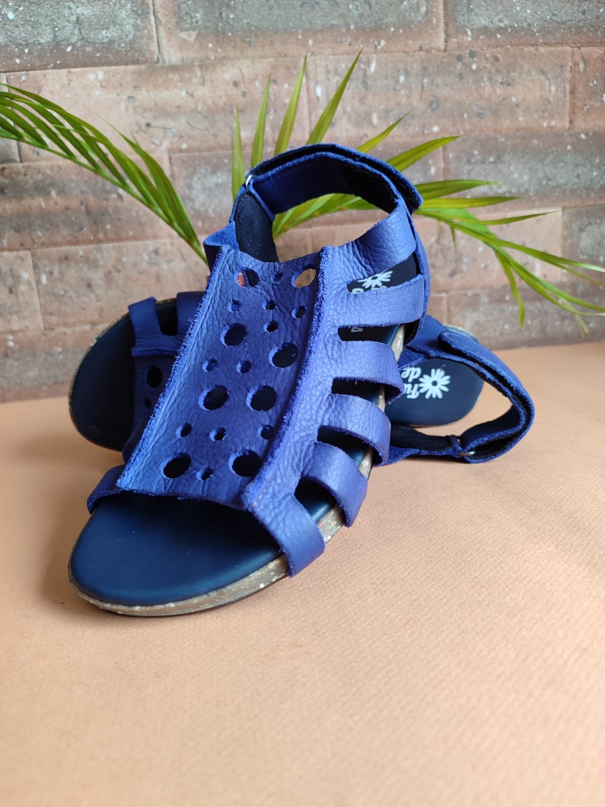 Sandálias Zilda, em couro azul royal, extramacio. As bolinhas recortadas no couro trazem a personalidade do estilo retrô. Palmilhas macias e solados antiderrapante em borracha reciclada.
